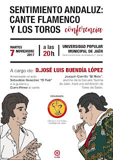 El Circulo Cultural Taurino ha organizado para el próximo martes 7 de noviembre a las 20 horas una conferencia a cargo de D. Jose Luis Buendia López con el título: «SENTIMIENTO ANDALUZ: EL FLAMENCO Y LOS TOROS«.
