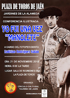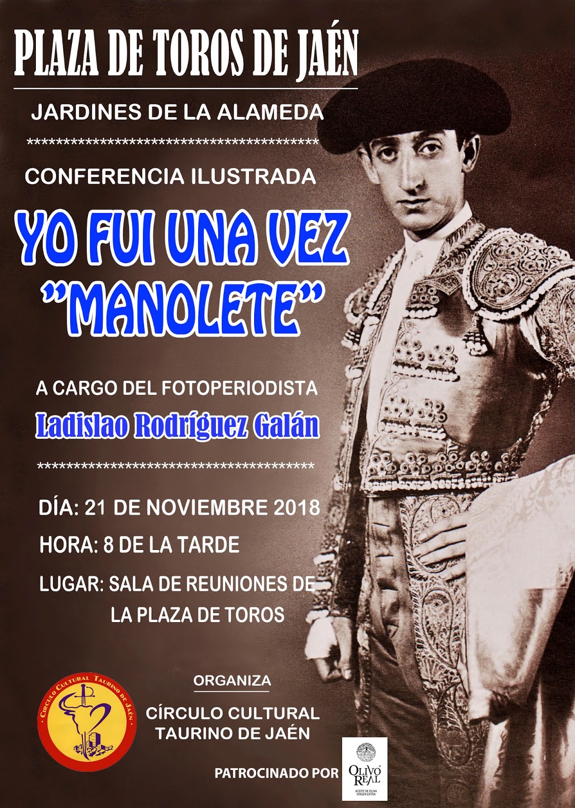 El próximo miércoles 21 de noviembre a las 20 horas tendremos una interesante y amena conferencia ilustrada en el salón social de la Plaza de Toros de Jaén bajo el título «Yo fuí una vez Manolete».