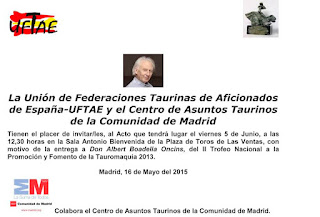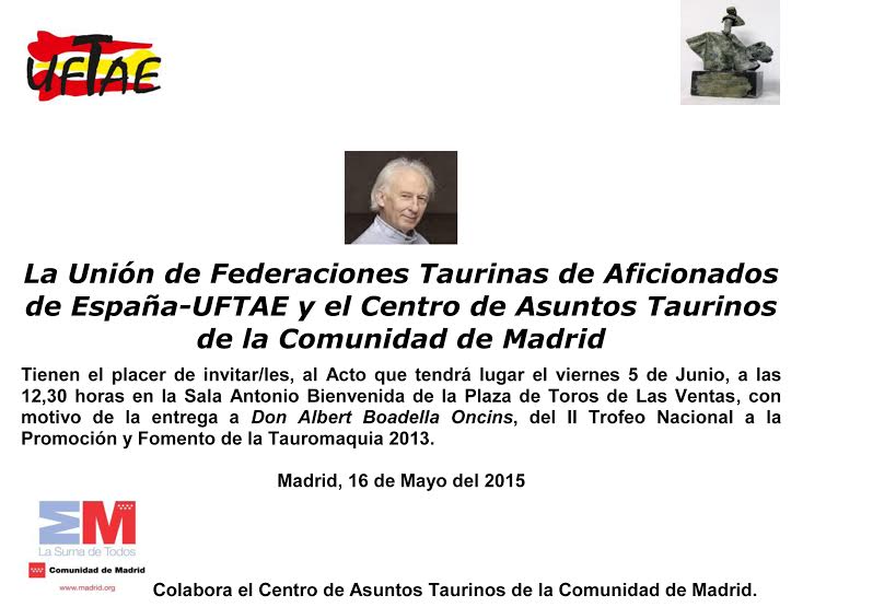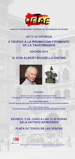Adjunto les remitimos para su conocimiento y difusión, programa e invitación al Acto de entrega del II Trofeo Nacional a la Promoción y Fomento de la Tauromaquia, a don Albert Boadella Oncins, que tendrá lugar el próximo viernes día 5 de Junio a las 12,30 horas en la Sala Bienvenida de Las Ventas.