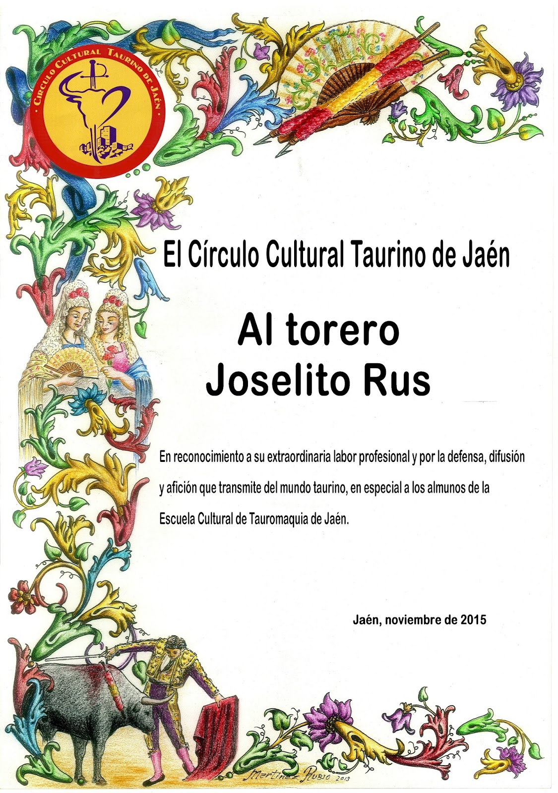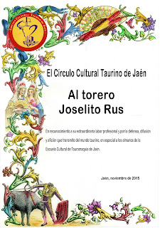 En esta ocasión nos acompañaron Lope Morales, Presidente de la Federación Taurina de Jaén, el crítico taurino José Luis Marín y el torero de plata Joselito Rus a quien el Círculo le rindió un sencillo reconocimiento entregándole un obsequio.